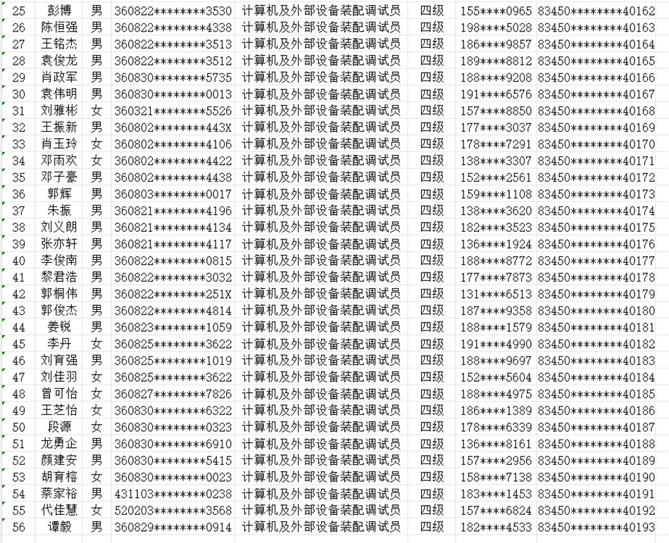 按照《贛人社規(guī)〔2022〕7號》文件精神。我校于2025年10月24日開展了計算機及外部設備裝配調試員(計算機整機裝配調試員)等級認定,共58人(四級),通過認定考核56人?,F(xiàn)對認定考核合格人員進行公示。(名單附后)
