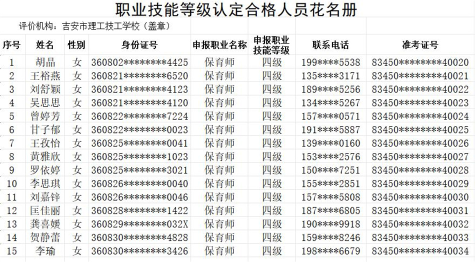 按照《贛人社規(guī)〔2022〕7號(hào)》文件精神。我校于2025年10月24日開展了保育師等級(jí)認(rèn)定,共15人(四級(jí)),通過認(rèn)定考核15人?,F(xiàn)對(duì)認(rèn)定考核合格人員進(jìn)行公示。(名單附后)