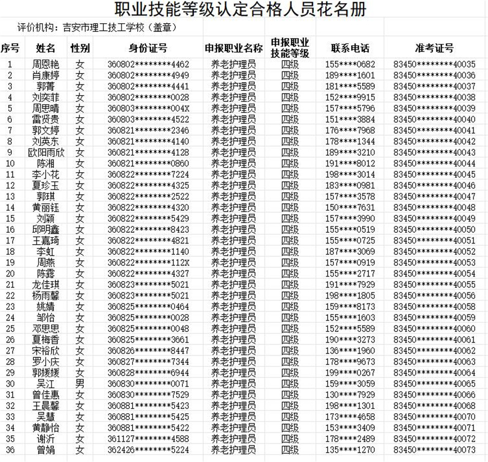 按照《贛人社規(guī)〔2022〕7號(hào)》文件精神。我校于2025年10月24日開展了養(yǎng)老護(hù)理員等級(jí)認(rèn)定,共39人(四級(jí)),通過認(rèn)定考核36人?,F(xiàn)對(duì)認(rèn)定考核合格人員進(jìn)行公示。(名單附后)
