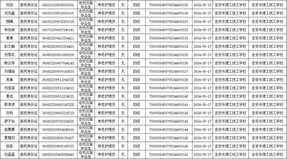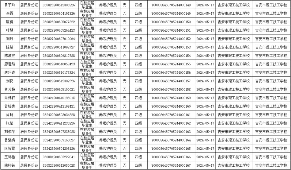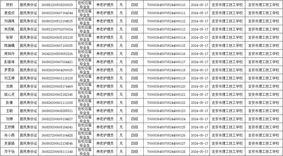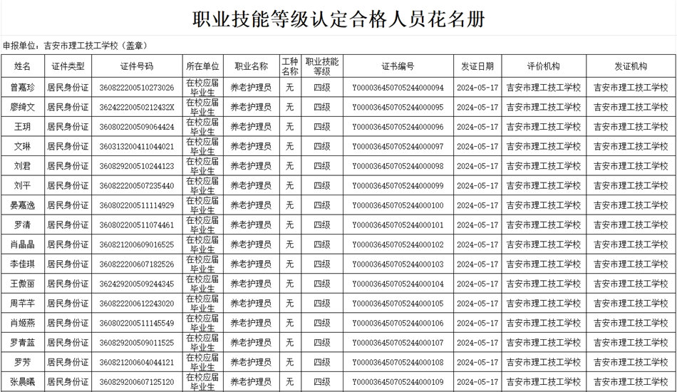 按照《關于開展“互聯網+職業(yè)技能等級認定”試點工作的通知》(贛人社字〔2020〕397號)精神。我校于2024年4月1日開展了養(yǎng)老護理員等級認定,共76人(四級),通過認定考核74人。現對認定考核合格人員進行公示(名單附后):