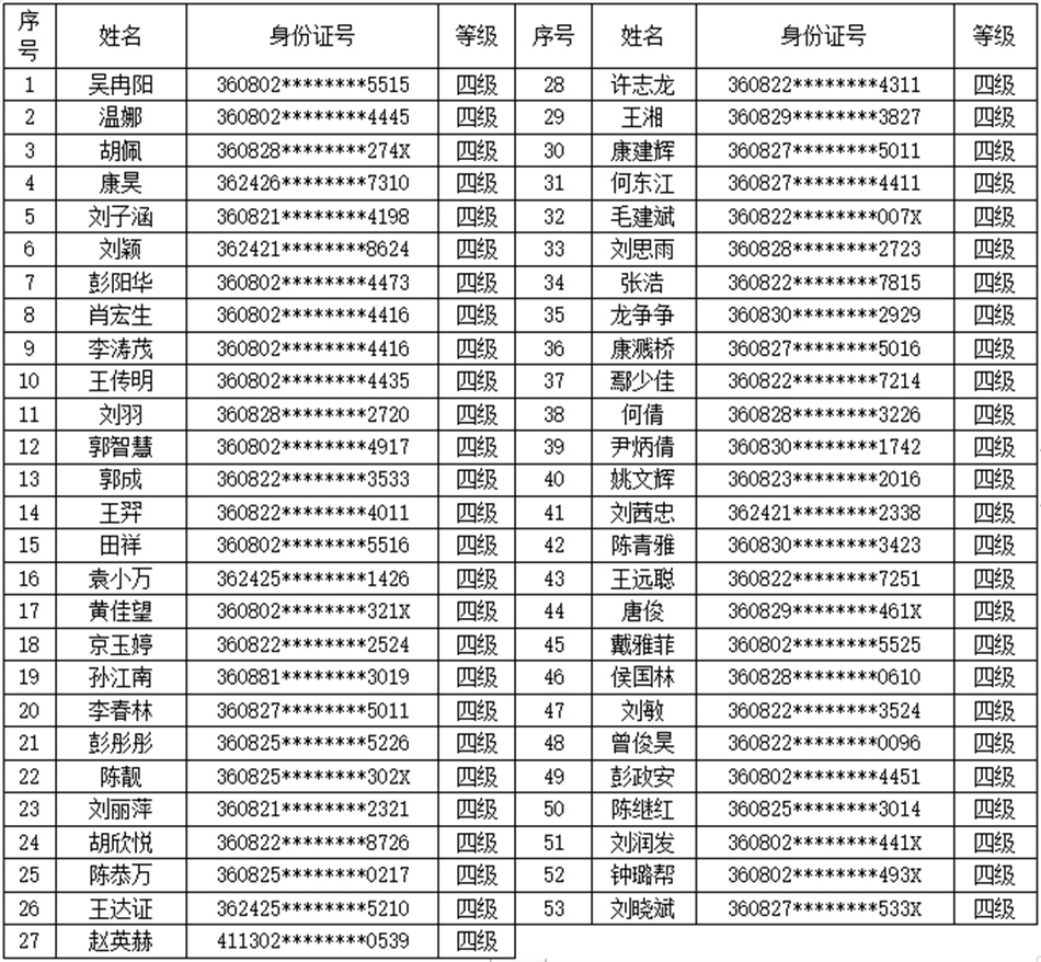 根據(jù)《江西省人力資源和社會保障廳關(guān)于遴選備案職業(yè)技能等級認(rèn)定社會培訓(xùn)評價組織的通知》(贛人社字(2020)302號)、《江西省人力資源和社會保障廳關(guān)于公布江西省第二批職業(yè)技能等級認(rèn)定社會培訓(xùn)評價組織的通知》(贛人社字(2022)128號)文件要求。按照《關(guān)于開展“互聯(lián)網(wǎng)+職業(yè)技能等級認(rèn)定”試點工作的通知》(贛人社字〔2020〕397號)精神。我校于2024年4月12日開展了電子商務(wù)師(網(wǎng)商)等級認(rèn)定,共54人(四級),通過認(rèn)定考核53人?,F(xiàn)對認(rèn)定考核合格人員進(jìn)行公示(名單附后)。
