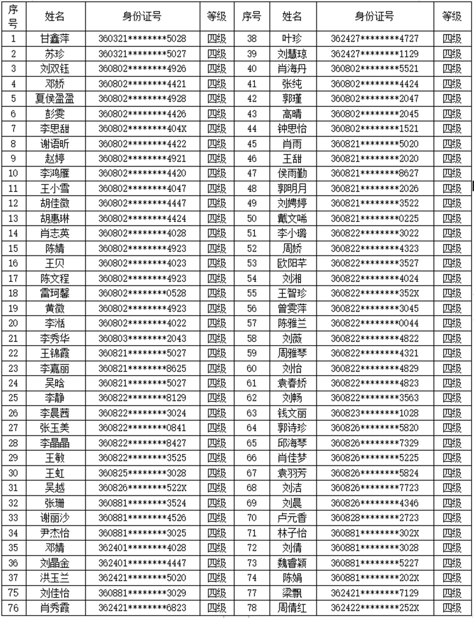 根據(jù)《江西省人力資源和社會(huì)保障廳關(guān)于遴選備案職業(yè)技能等級認(rèn)定社會(huì)培訓(xùn)評價(jià)組織的通知》(贛人社字(2020)302號)、《江西省人力資源和社會(huì)保障廳關(guān)于公布江西省第二批職業(yè)技能等級認(rèn)定社會(huì)培訓(xùn)評價(jià)組織的通知》(贛人社字(2022)128號)文件要求。按照《關(guān)于開展“互聯(lián)網(wǎng)+職業(yè)技能等級認(rèn)定”試點(diǎn)工作的通知》(贛人社字〔2020〕397號)精神。我校于2024年4月11日開展了保育師等級認(rèn)定,共82人(四級),通過認(rèn)定考核78人?,F(xiàn)對認(rèn)定考核合格人員進(jìn)行公示(名單附后)。